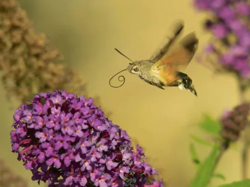 The humming-bird hawk-moth migrates to the UK from Southern Europe each year. It can be seen hovering over flowers, feeding with its long proboscis; its wings move so quickly that it 'hums'.