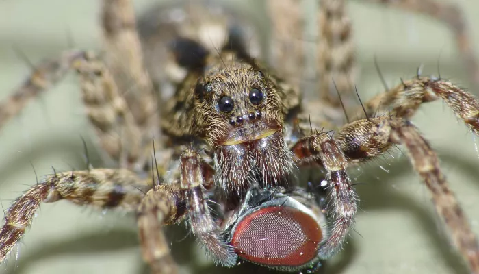 The wolf spider shows various patterns of dark grey, brown and black, and is quite hairy. There are several species of wolf spider, which are very difficult to tell apart.
