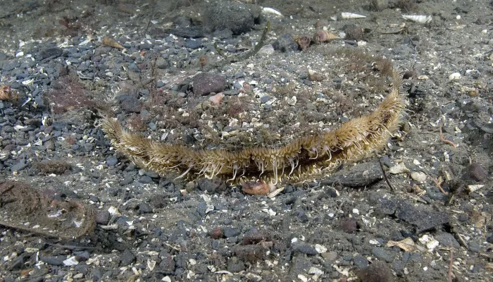 Great scallops are a large bivalve mollusc, its shell familiar to us all with its radiating ridges and characteristic scallop wings by the hinge. The 2 shells are actually different: one is curved like a bowl and the upper shell is flat like a lid. They live in a self-dug hollow on sandy or gravelly seabeds and are filter feeders, filtering out plankton and other micro-organisms. Scallops are a favourite food of starfish, but can actually swim out of harm's way by rapidly opening and shutting their shells, sending out jets of water which propel them over short distances.