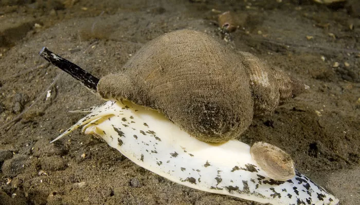 The common whelk lives on sandy seabeds below the low tide mark. It is the largest sea snail found in our seas and therefore the largest snail shell you are likely to find on our beaches. It lays its eggs in a spongy mass of up to 2000 egg capsules on the seabed. Once hatched, these balls of empty egg capsules often wash up on shore.The common whelk is carnivorous and feeds on worms and other molluscs, often using the edge of its own shell to prize open other shells. It also scavenges for carrion, which it finds by smell.