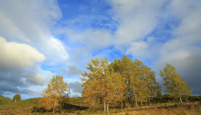 Aspen is a medium-sized tree with greyish bark, hanging catkins and small, rounded leaves that have pale undersides and flutter distinctively in the wind; they turn vibrant yellow in autumn.