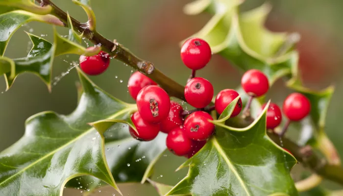 Holly is easily recognised by its combination of dark green, spiny, evergreen leaves and small, bright red berries.