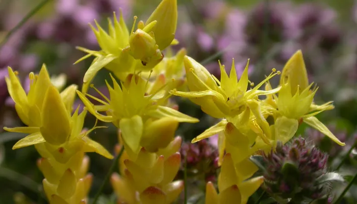 Biting stonecrop is a mat-forming plant that is common on well-drained ground, such as sand dunes, shingle, grasslands, walls and pavements. It has yellow, star-shaped flowers that appear from May to July, and fleshy leaves that have a biting-hot taste. It attracts many bees in search of nectar.