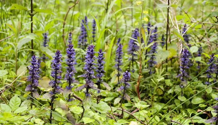Low-growing and creeping, bugle has large, oval leaves spread out in a rosette at its base, and smaller leaves growing up its flower spike. Small, purple flowers with protruding stamen sprout in between the leaves and are shaped like skirted ladies, often with faint stripes running down them.