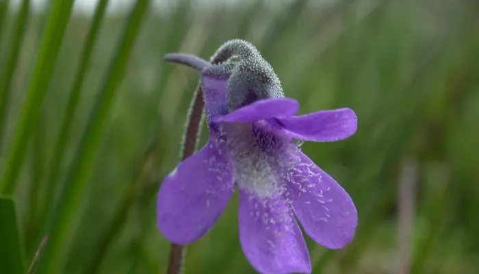 Common butterwort has a rosette of yellow-green and sticky leaves that appear flat to the ground and are shaped like a star. It produces around two or three upright flower stalks which bear small, deep purple flowers.