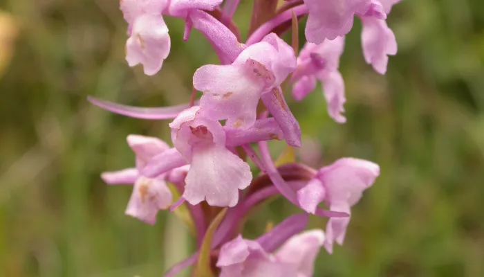 The Common fragrant-orchid displays clusters of pink flowers that have a three-lobed lip, a hood and a long spur trailing behind them. The cylindrical head of flowers can measure up to 15cm in height. A few, narrow, green leaves appear at the base of the plant and up the stem.