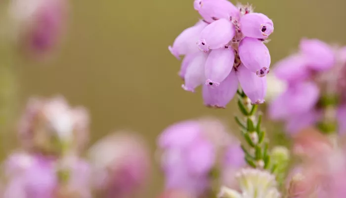 Cross-leaved heath has pink, bell-shaped flowers clustered at the end of long, branched stems. Grey-green leaves are narrow and sit in whorls of four. It is similar to Bell Heather, but its flowers are larger and sit in a small cluster on one side of the stem.