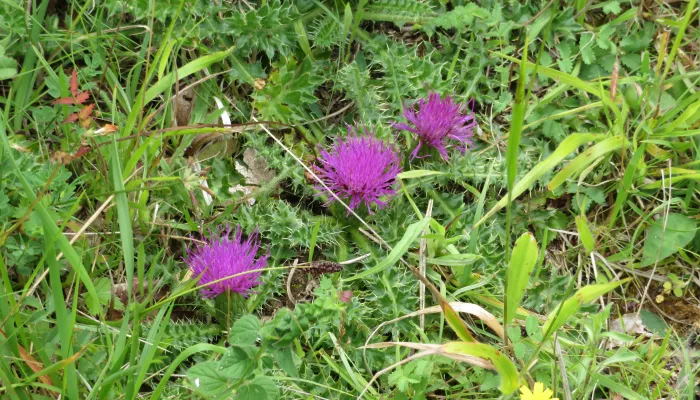 The Dwarf thistle displays a purple, solitary flower head on top of a rosette of spiny, hairy leaves. It is almost stemless, and is very low-growing.