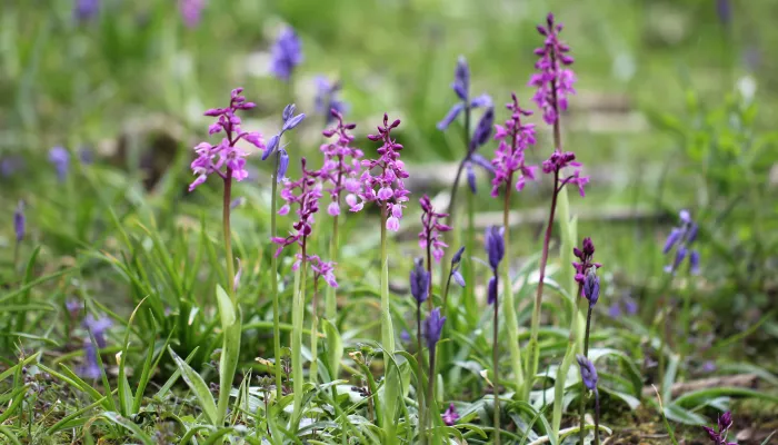 As its name suggests, the Early purple orchid is one of our earliest flowering orchids, appearing from April to June. It is often found in habitats with non-acidic soils, such as hedgerows, banks, ancient woodland and open grassland. The pinkish-purple flowers appear on a spike of medium height.