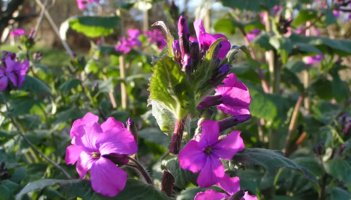 Honesty has heart-shaped, green leaves with toothed edges, and pink, purple or white flowers with four petals. The flowers are followed by the recognisable oval, papery seed pods.