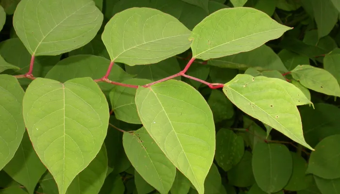 Japanese knotweed is a very tall plant with large triangular leaves, hollow, red stems that are a bit like bamboo, and small, white, tufty flowers that appear in late summer and autumn.