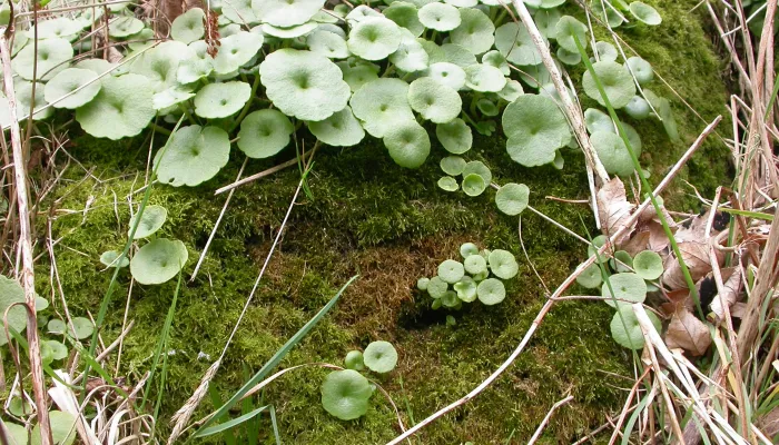 Navelwort has round, green, succulent leaves that look like coins, and straw-coloured, thin, candle-like flower spikes.
