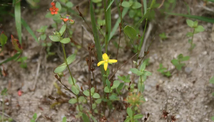 Toadflax-leaved St John's-wort is one of a number of similar species: look for reddish stems, and long, thin leaves that grow from opposite sides of the stalk. Star-shaped flowers are bright yellow and delicately dotted at the edges with tiny, black glands.