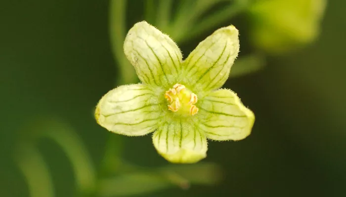 White bryony is a climbing hedgerow and woodland edge plant that flowers between May and August. It produces red and shiny berries that can be seen, covered in frost over winter. Our only native member of the cucumber family, White bryony is actually highly poisonous. The roots are particularly toxic and, despite their bitter taste, sometimes get eaten by cattle with fatal consequences.